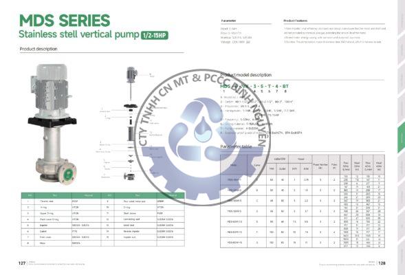 Vật liệu: Thân,buồng và cánh bơm SUS304 (hoặc bản cao cấp bằng PVDF),Gioăng đệm N-NBR/E-EPDM/ V-VITON